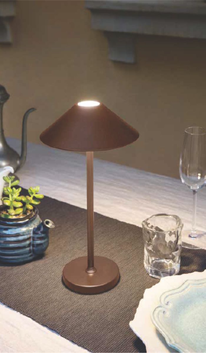 Lampada senza fili con ricarica USB. Accensione spegnimento e dimmerazione della luce con sistema touch. Disponibile in diversi colori: Bianco, Salvia, Corten e Nero. 8 ore di autonomia con 100% di intensità luminosa.
