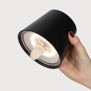 La lampada si accende e si spegne tramite un pulsante touch posto sulla sommità del diffusore; con lo stesso pulsante è possibile regolare la temperatura di colore della luce (2200K, 2700K o 3000K) e l’intensità del flusso luminoso. La lampada è adatta sia all’uso interno che esterno (IP54).