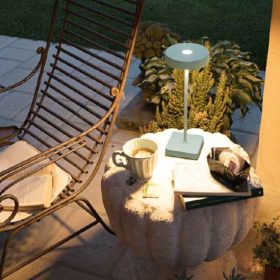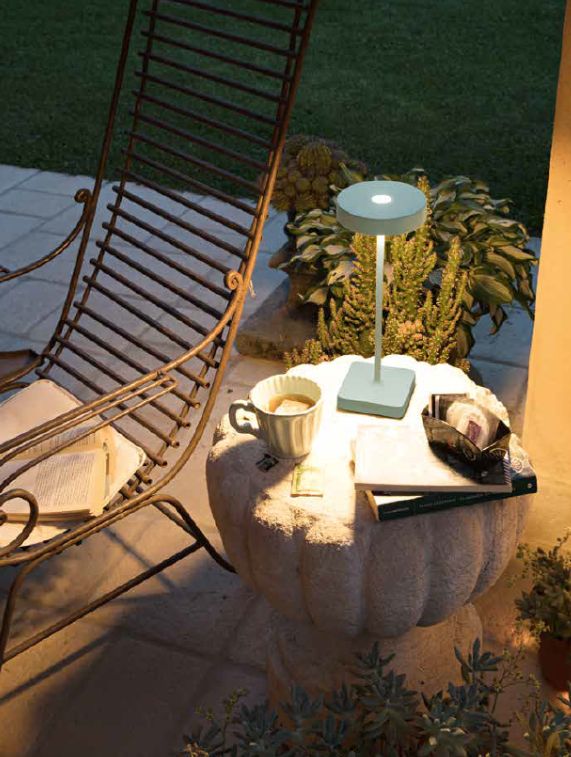 Disponibile in diversi colori: Bianco, oro, salvia, blu avion, corten e antracite. 8 ore di autonomia con 100% di intensità luminosa.